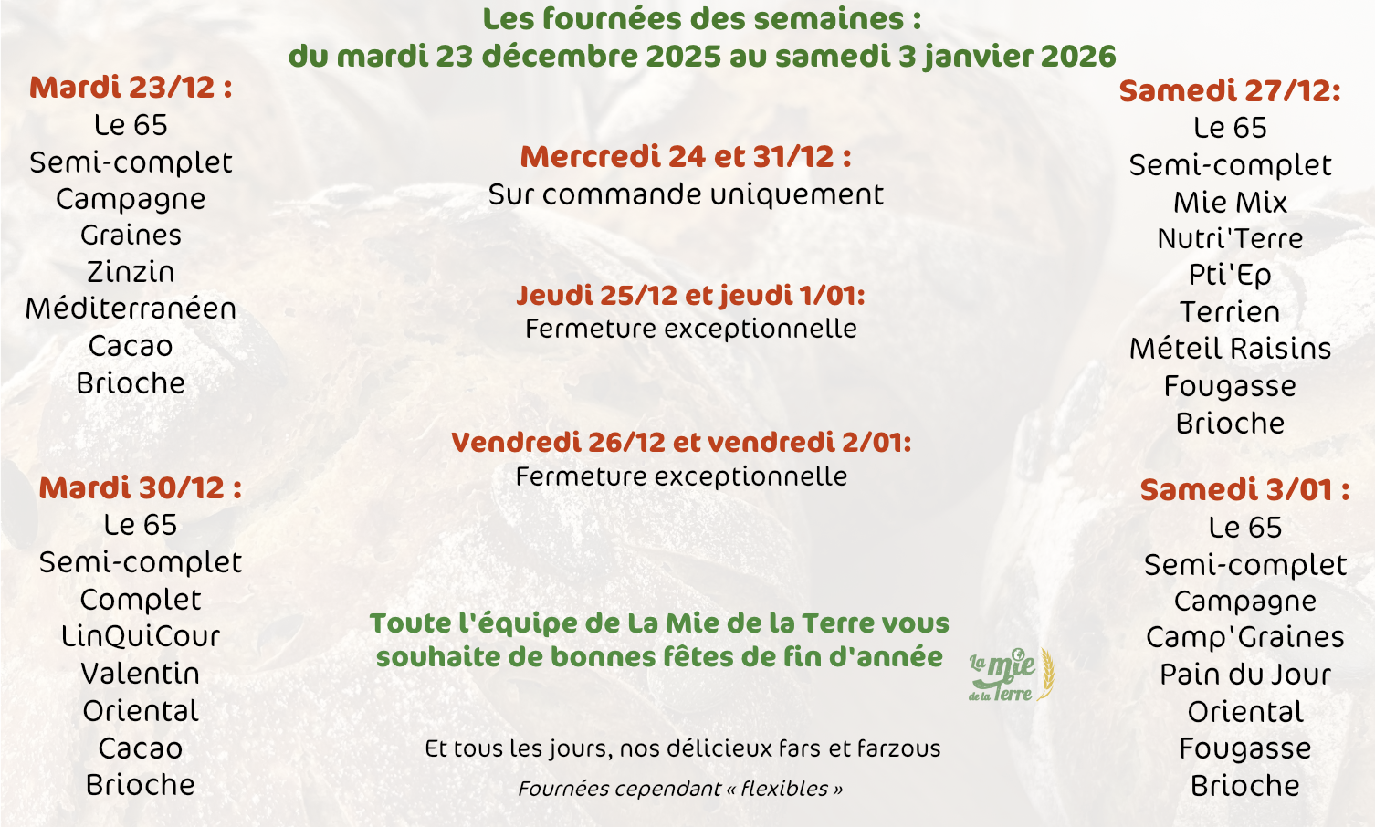 Mercredi 24 décembre : 10h30 – 17h30 uniquement sur commande